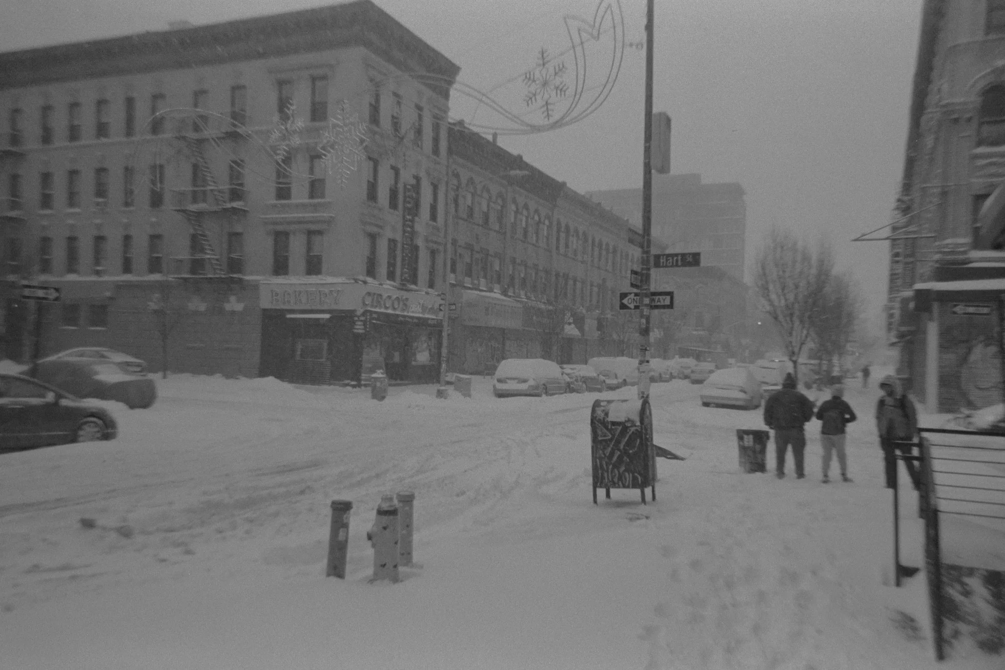 a few people venture north on Knickerbocker Avenue.